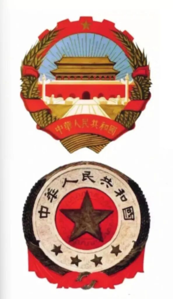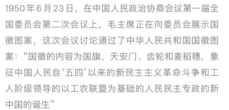 “国徽的内容为国旗、天安门、齿轮和麦稻穗,象征中国人民自‘五四’以来的新民主主义革命斗争和工人阶级领导的以工农联盟为基础的人民民主专政的新中国的诞生。”