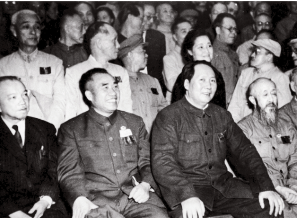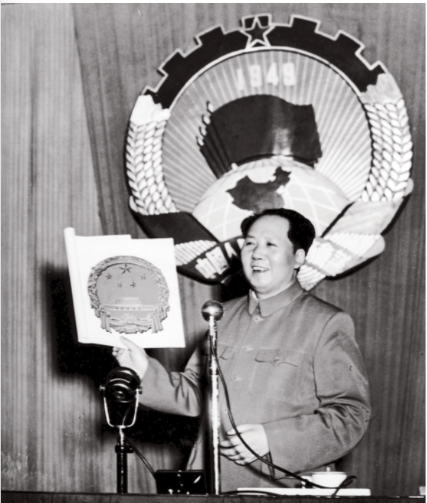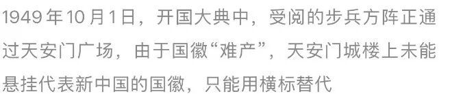 在开国大典上,天安门城楼两重飞檐之间,是“中华人民共和国中央人民政府成立典礼”几个大字,原来设计好悬挂的国徽,并没有出现。