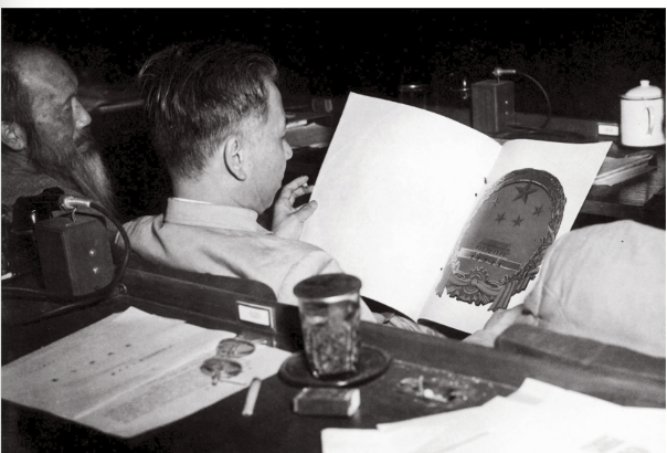1949年9月25日,经过与会者反复讨论,通过了国旗、国歌方案,但大家都对国徽应征图稿不满意。但重新组织国徽设计已经来不及了。最后,毛泽东拍板说,国旗已经决定了,国徽是否可以慢一点决定,原小组仍继续设计,等将来交给中央人民政府去决定。9月27日,第一届全国政协第一次全体会议讨论并通过了国旗、国都、纪年和国歌四个决议案,只有国徽暂付阙如。因为这个原因,1949年10月1日开国大典举行时,天安门城楼上未能悬挂代表新中国的国徽,只能用“中华人民共和国中央人民政府成立大典”的横标来替代。
